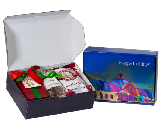 Bring the magic of the season to your most deserving customers and employees with a gift from the Balboa Park Collection. Our signature size delivers an assortment of novelty treats including authentic, French caramel candies from San Diego's local business, Le Caramel. The classic size is ideal for employee appreciation and small seasonal gifting. Choose your ribbon color in the notes at checkout (red or green) and opt to add your company logo to the packaging. Handmade to stock up and share, we specialize in custom, bundle orders.