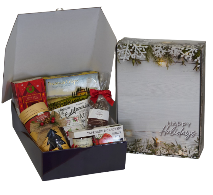 Enjoy a festive treat from the Happy Holidays Limited Collection. Our grand size delivers an assortment of novelty treats including those that satisfy your savory and sweet sides. Delight in chocolate covered pretzels, cranberry jellied fruit, artisan crisps, medjool dates, brownie crisps, authentic Le Caramel candies and so much more. The grand size is ideal for making a lasting impression and showing genuine appreciation for customers, employees and colleagues. Choose your ribbon color or opt to imprint your company logo on any color ribbon by choosing the custom option. Handmade to stock up and share, we specialize in custom, bundle orders.