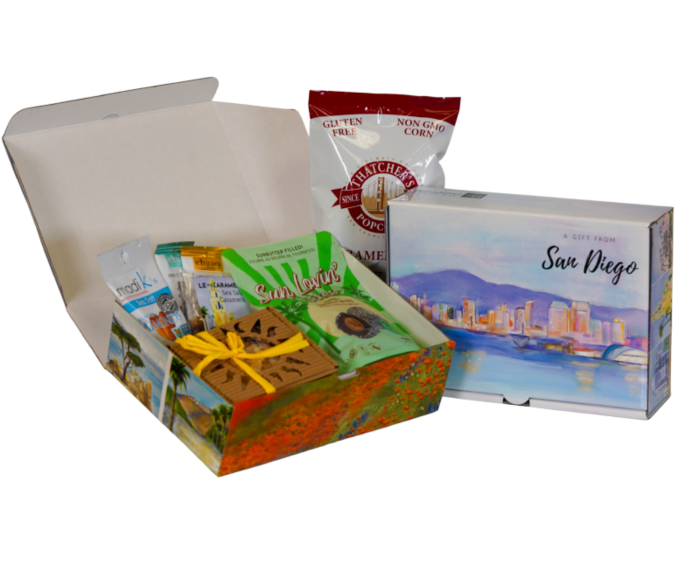 Stunning before it is even opened, a Gift from San Diego is a gorgeous artistic display of popular points of interest around America's Finest City. Filled with delicious, edible goodies, it's sure to excite taste buds nationwide. Enjoy salty and sweet treats from the state of California, including award-winning French Le Caramel candies. Delight convention crowds, meeting attendees, hospitality invitees, wedding guests, colleagues and friends alike with an inspiring gift from San Diego.