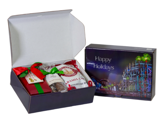 An exhilarating gift, the Belmont Park Holiday Collection of gift boxes is this season's must-have! Our signature size delivers an assortment of novelty treats including authentic, French caramel candies from San Diego's local business, Le Caramel. The classic size is ideal for employee appreciation and small seasonal gifting. Choose your ribbon color in the notes at checkout (red or green) and opt to add your company logo to the packaging. Handmade to stock up and share, we specialize in custom, bundle orders.