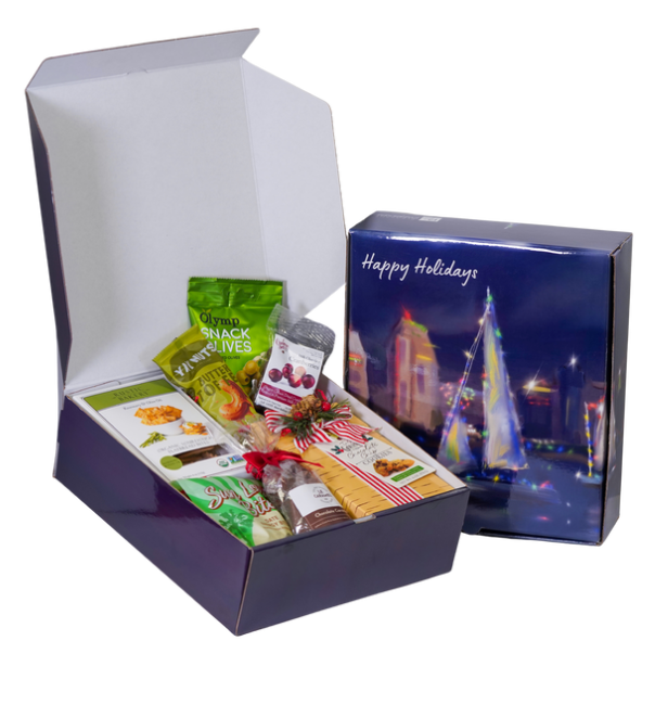 Enjoy a festive treat from the Limited Holiday Collection. Our Boat Parade deluxe size delivers an assortment of artisan treats including artisan olives, chocolate chip cookies, sun lovin bites, milk chocolate cranberries, gourmet nuts, savory crisps and authentic, French caramel candies from San Diego's local business, Le Caramel. The deluxe size is ideal for employee recognition, seasonal business gatherings and convention welcomes. Opt to add your company logo to the festive packaging. Handmade to stock up and share, we specialize in custom, bundle orders.
