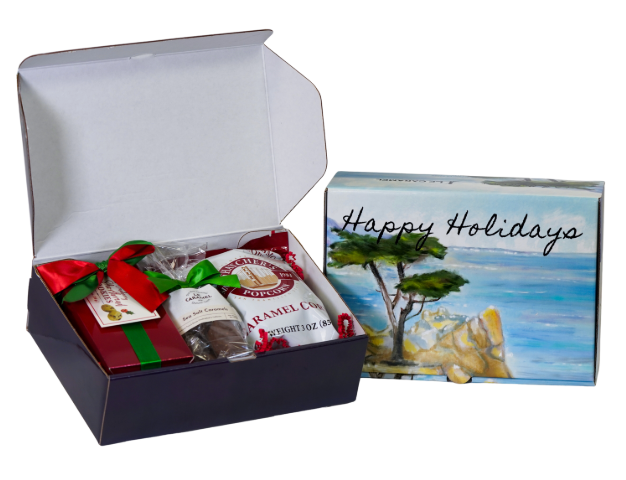 The ocean breeze of the holiday season is brought to your front door in the Coastal Holiday Tree gift. Our signature size delivers an assortment of novelty treats including authentic, French caramel candies from San Diego's local business, Le Caramel. The classic size is ideal for employee appreciation and small seasonal gifting. Choose your ribbon color in the notes at checkout (red or green) and opt to add your company logo to the packaging. Handmade to stock up and share, we specialize in custom, bundle orders.