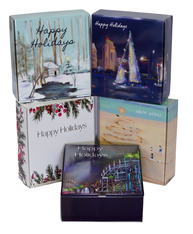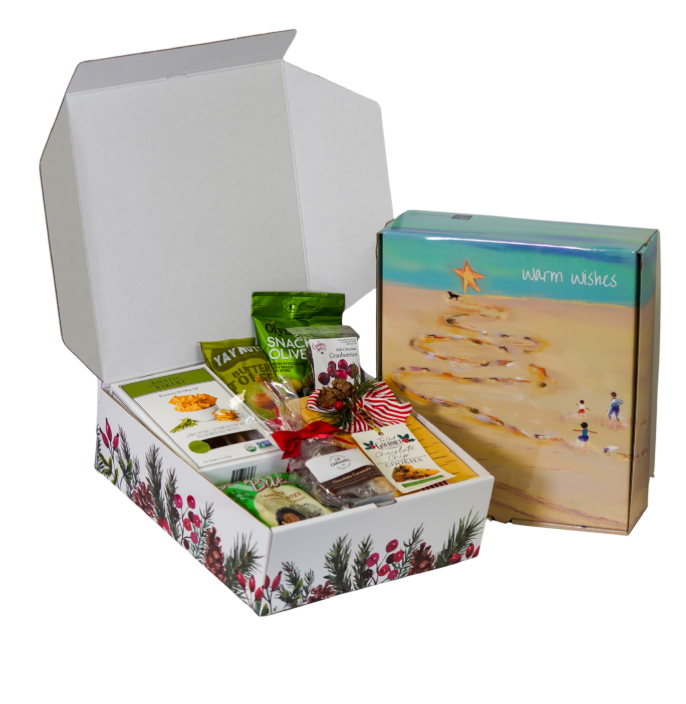 Enjoy a festive treat from a beautiful Holiday Collection. Our Warm Wishes deluxe size delivers an assortment of artisan treats including artisan olives, chocolate chip cookies, sun lovin bites, milk chocolate cranberries, gourmet nuts, savory crisps and authentic, French caramel candies from San Diego's local business, Le Caramel. The deluxe size is ideal for employee recognition, seasonal business gatherings and convention welcomes. Opt to add your company logo to the festive packaging. Handmade to stock up and share, we specialize in custom, bundle orders.